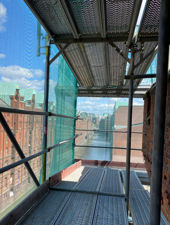 Denkmalgerechte Oberflächenvorbereitung und Putzarbeiten in historischen Backsteinspeichern im laufenden Besucherbetrieb.